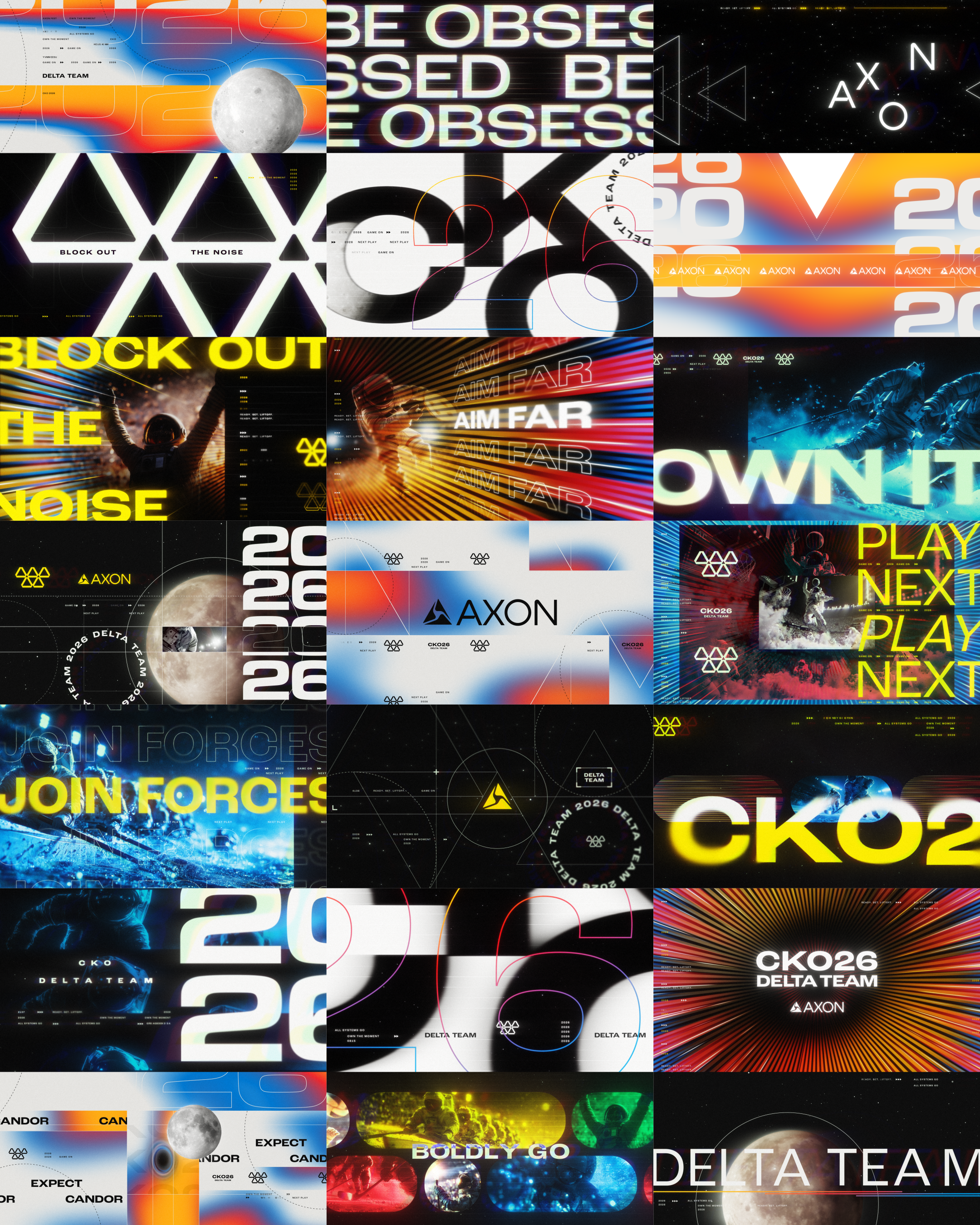 Typographic motifs, linework, and interface-style elements support the tech aesthetic within part two of the logo loop and are unified with the Axon Olympic-inspired logo, the CKO26 Delta Team wordmark, and the Axon symbol. Structured, grid-based layouts with oversized typography and repeated imagery deliver impact, reinforce brand cohesion, and bring the visual system to a confident, unified close.
