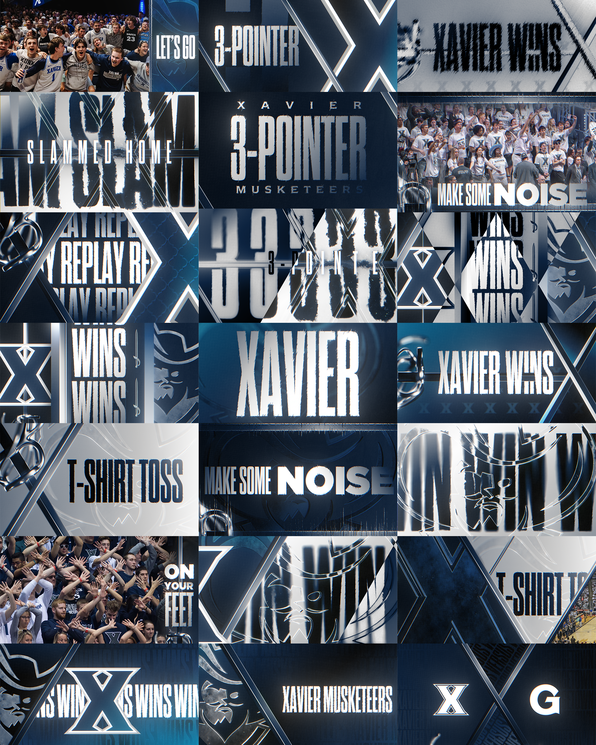 The Xavier Wins prompt uses the package’s diagonal structure, refined sword accents, and subtle 3D logo treatments to create a steady, atmospheric backdrop for victory moments. Soft wipes, gentle glow, and light refraction add energy without distraction, resulting in a clear, elevated win graphic that feels unmistakably Xavier.
